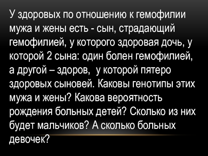 сын, страдающий гемофилией, у которого здоровая дочь, у которой 2 сына: один болен гемофилией, а другой – здоров, у которой пятеро здоровых сыновей. Каковы генотипы этих мужа и жены? Какова вероятность рождения больных детей? Сколько из них будет мальчиков? А сколько больных девочек?