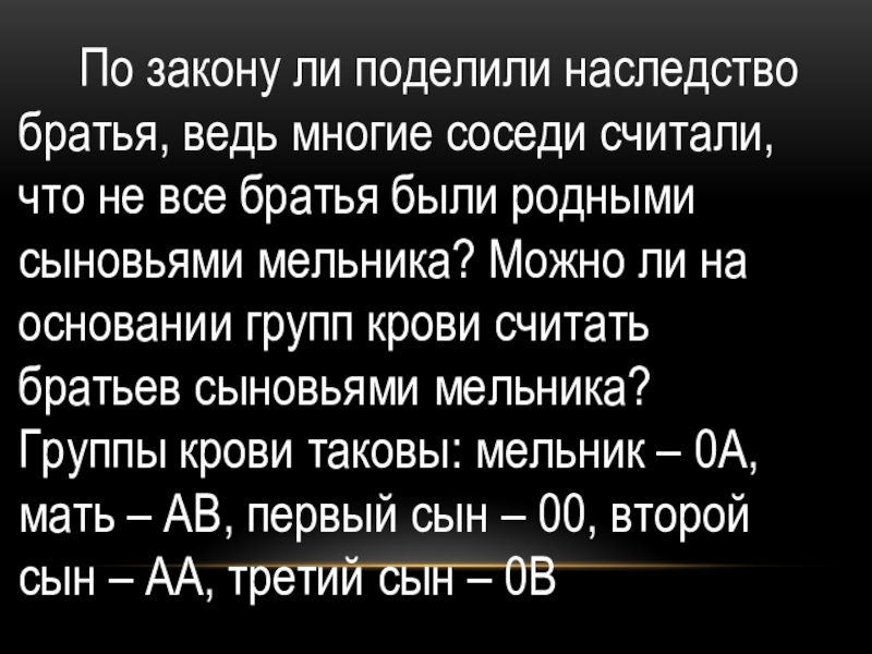 соседи считали, что не все братья были родными сыновьями мельника? Можно ли на основании групп крови считать братьев сыновьями мельника? Группы крови таковы: мельник – 0А, мать – АВ, первый сын – 00, второй сын – АА, третий сын – 0В