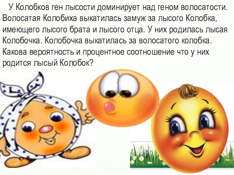Слайд 4 У Колобков ген лысости доминирует над геном волосатости. Волосатая