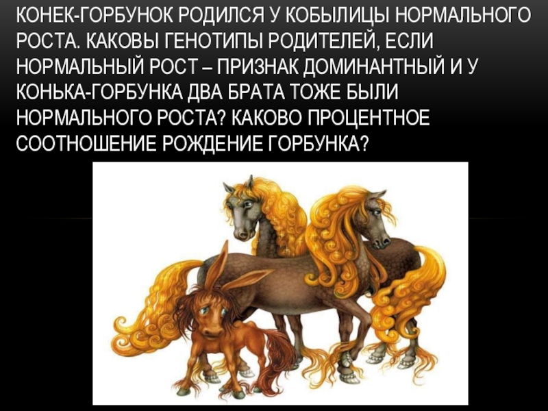 Слайд 5Конек-Горбунок родился у кобылицы нормального роста. Каковы генотипы родителей, если нормальный