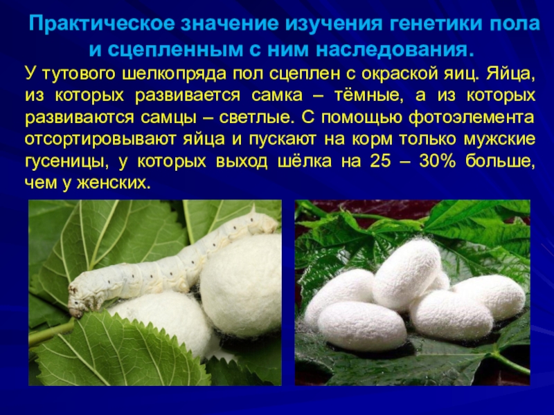 шелкопряда пол сцеплен с окраской яиц. Яйца, из которых развивается самка – тёмные, а из которых развиваются самцы – светлые. С помощью фотоэлемента отсортировывают яйца и пускают на корм только мужские гусеницы, у которых выход шёлка на 25 – 30% больше, чем у женских.