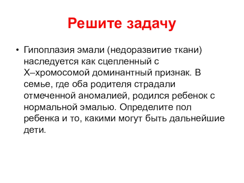 Х–хромосомой доминантный признак. В семье, где оба родителя страдали отмеченной аномалией, родился ребенок с нормальной эмалью. Определите пол ребенка и то, какими могут быть дальнейшие дети.