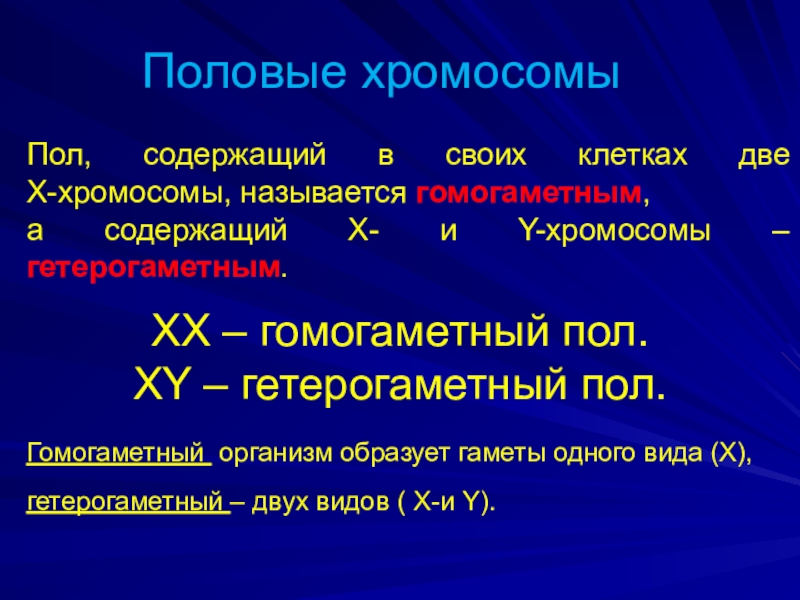 Гомогаметный организм образует гаметы одного вида (Х), гетерогаметный – двух видов ( Х-и Y).