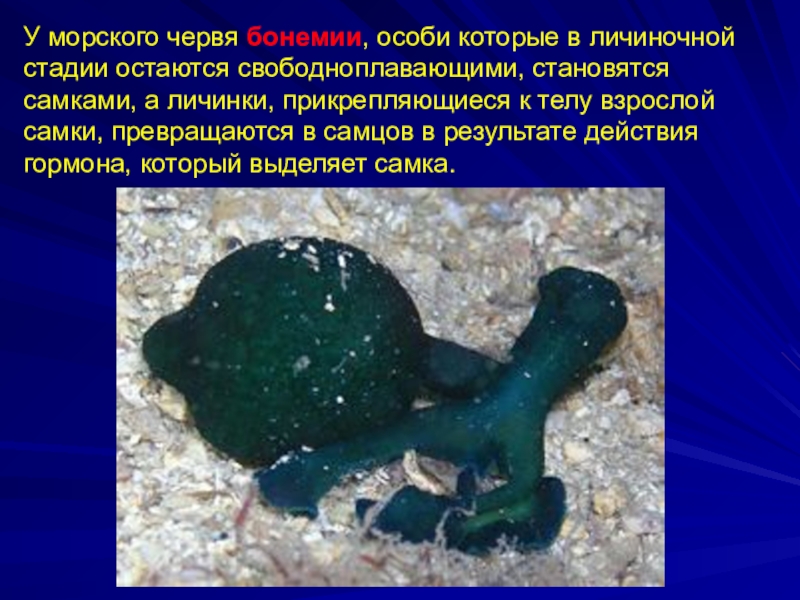 Слайд 11У морского червя бонемии, особи которые в личиночной стадии остаются свободноплавающими,