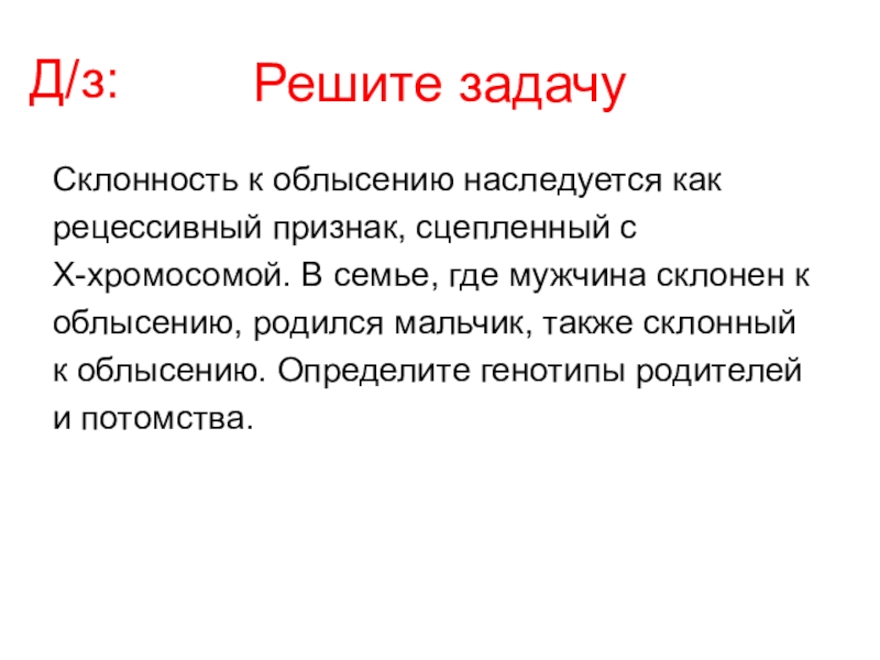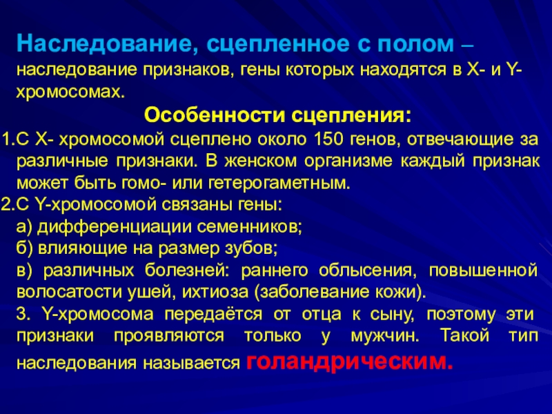 Слайд 13Наследование, сцепленное с полом –наследование признаков, гены которых находятся в Х-