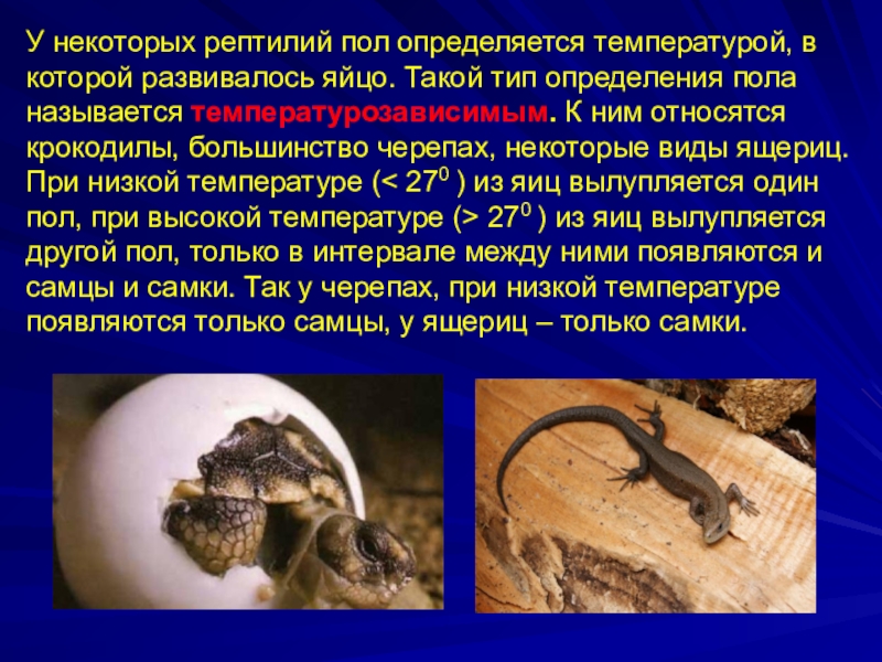 Слайд 10У некоторых рептилий пол определяется температурой, в которой развивалось яйцо. Такой