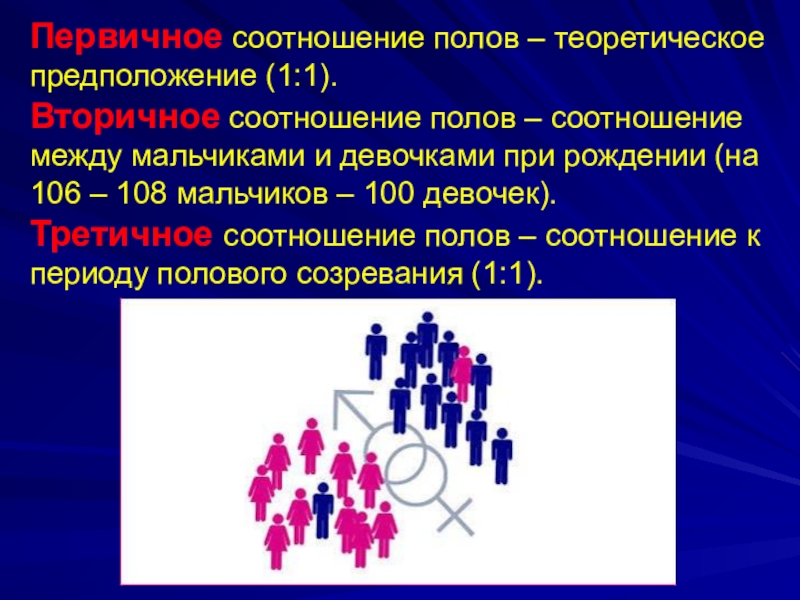 Слайд 12Первичное соотношение полов – теоретическое предположение (1:1).