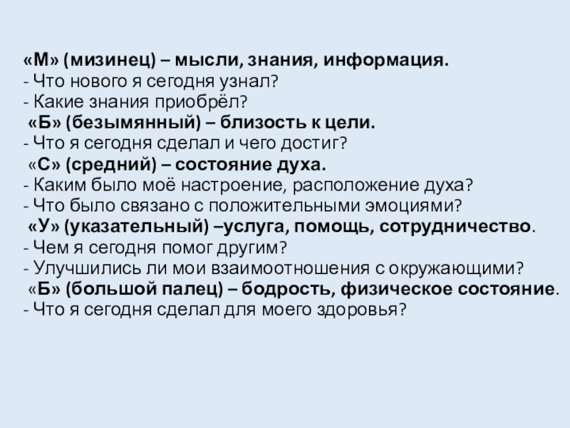 «Б» (большой палец) – бодрость, физическое состояние.