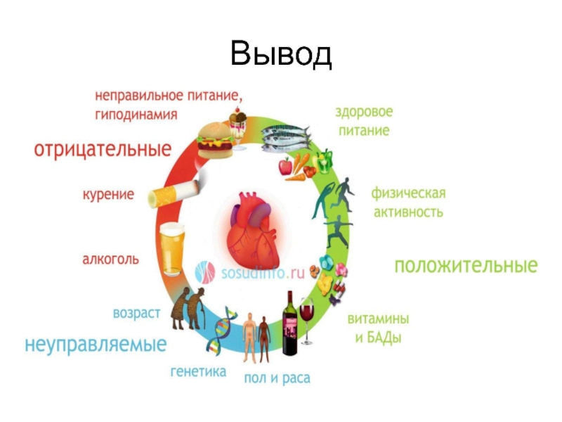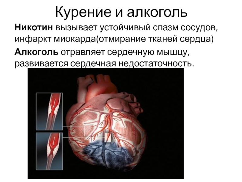 Курение и алкогольНикотин вызывает устойчивый спазм сосудов, инфаркт миокарда(отмирание тканей сердца)Алкоголь отравляет сердечную мышцу, развивается сердечная недостаточность.
