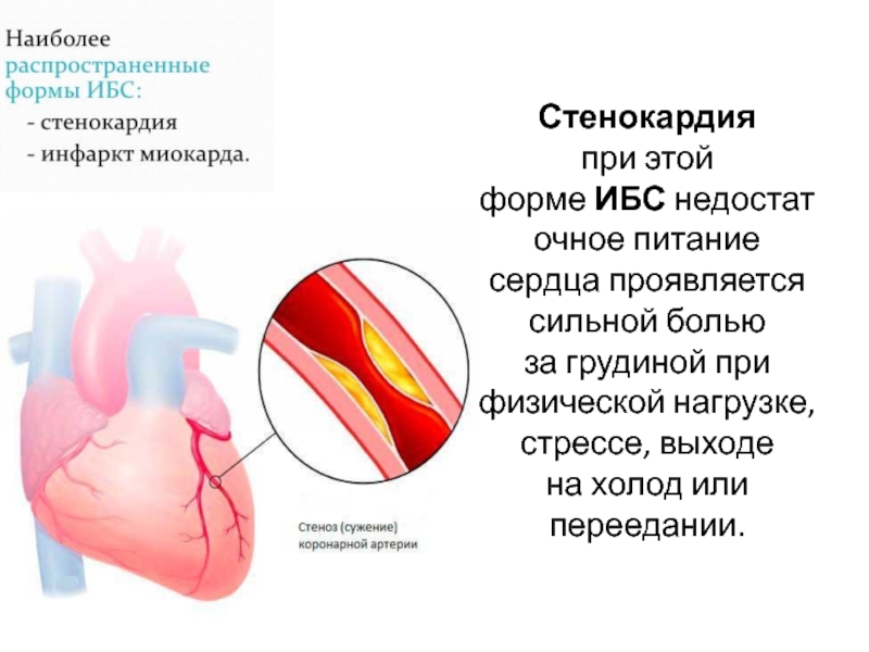 Стенокардия  при этой форме ИБС недостаточное питание сердца проявляется сильной болью за грудиной при физической нагрузке, стрессе, выходе на холод или