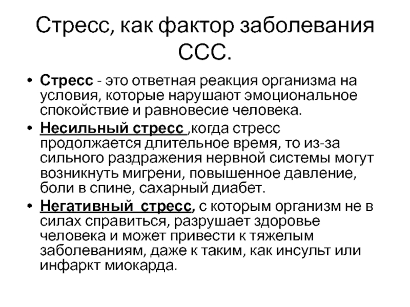 Стресс, как фактор заболевания ССС.Стресс - это ответная реакция организма на условия, которые нарушают эмоциональное спокойствие и равновесие