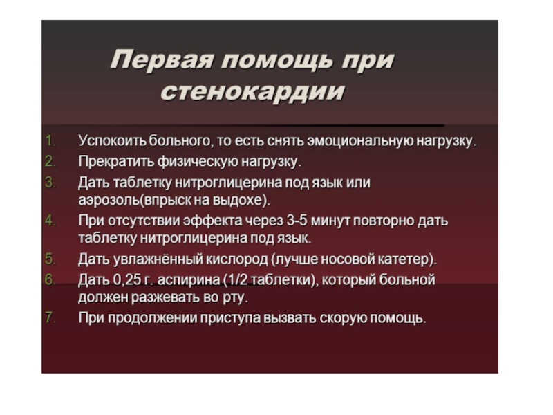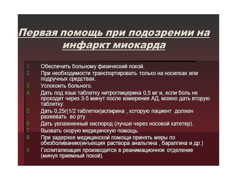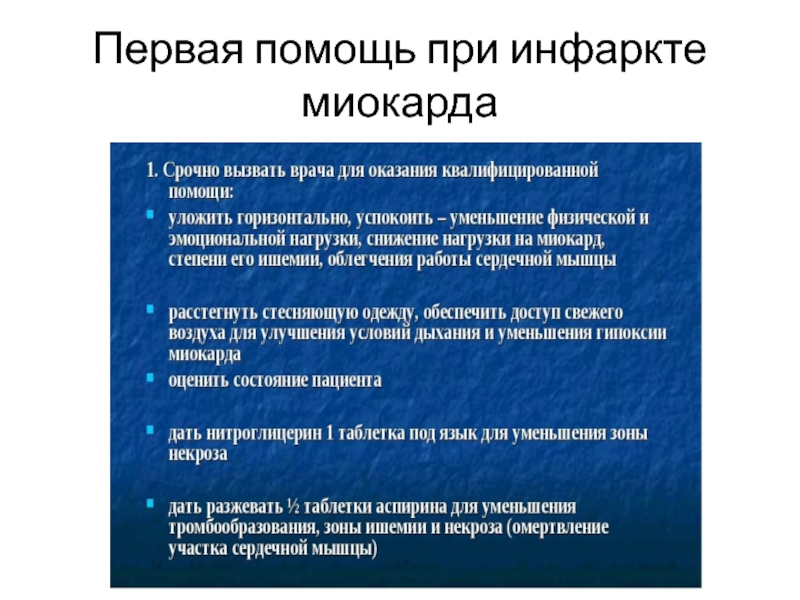 Слайд 22Первая помощь при инфаркте миокарда