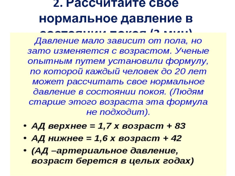 Слайд 42. Рассчитайте свое нормальное давление в состоянии покоя (3 мин)