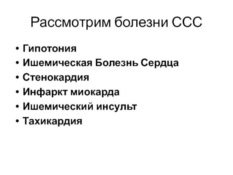 Рассмотрим болезни СССГипотонияИшемическая Болезнь СердцаСтенокардияИнфаркт миокардаИшемический инсультТахикардия