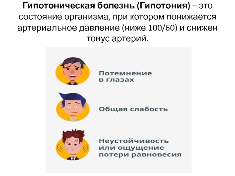 Слайд 19Гипотоническая болезнь (Гипотония) – это состояние организма, при котором понижается артериальное давление