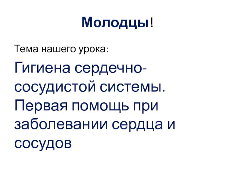 Молодцы!Тема нашего урока:Гигиена сердечно-сосудистой системы. Первая помощь при заболевании сердца и сосудов