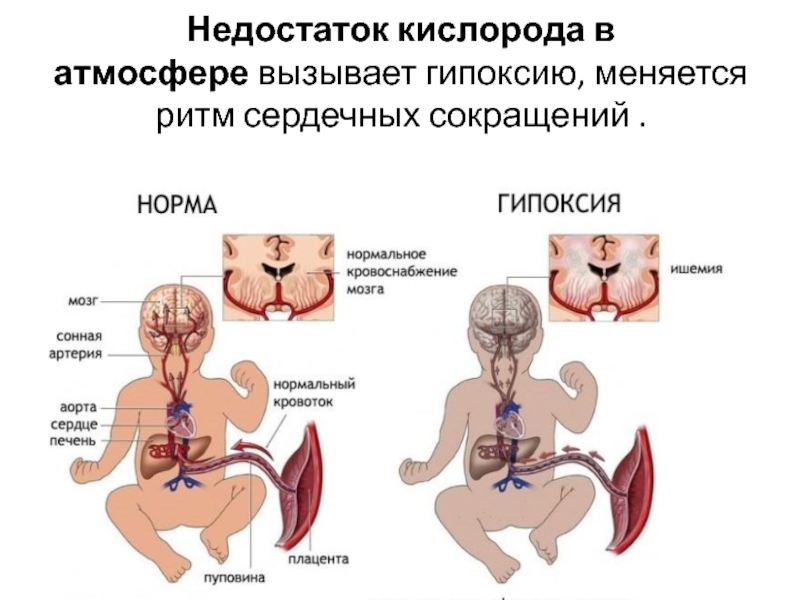 Слайд 13Недостаток кислорода в атмосфере вызывает гипоксию, меняется ритм сердечных сокращений .