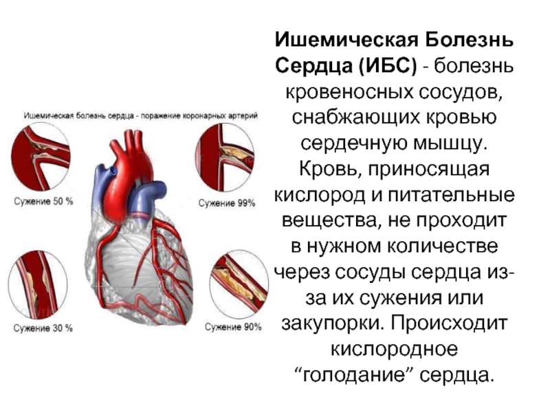 Слайд 23Ишемическая Болезнь Сердца (ИБС) - болезнь кровеносных сосудов, снабжающих кровью сердечную мышцу.