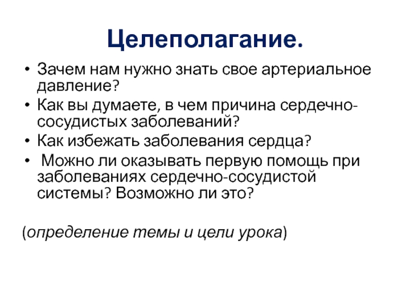 Целеполагание.Зачем нам нужно знать свое артериальное давление?Как вы думаете, в чем причина сердечно-сосудистых заболеваний?Как избежать заболевания сердца?