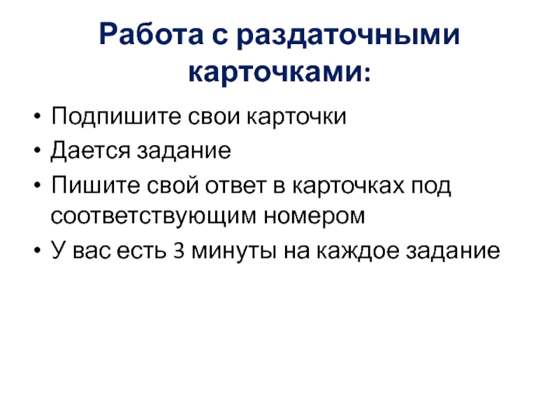 Работа с раздаточными карточками:Подпишите свои карточки Дается заданиеПишите свой ответ в карточках под соответствующим номеромУ вас есть 3 минуты на каждое задание