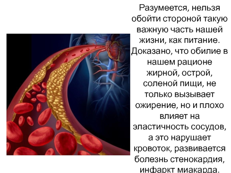 Доказано, что обилие в нашем рационе жирной, острой, соленой пищи, не только вызывает ожирение, но и плохо влияет на эластичность сосудов, а это нарушает кровоток, развивается болезнь стенокардия, инфаркт миакарда.