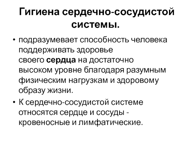 Гигиена сердечно-сосудистой системы.подразумевает способность человека поддерживать здоровье своего сердца на достаточно высоком уровне благодаря разумным физическим нагрузкам и здоровому образу жизни. К