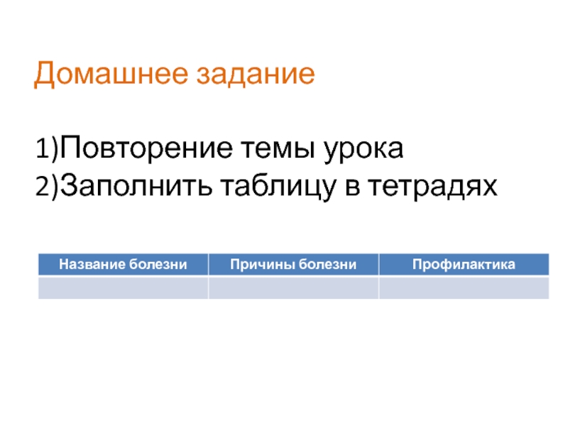 Домашнее задание  1)Повторение темы урока 2)Заполнить таблицу в тетрадях