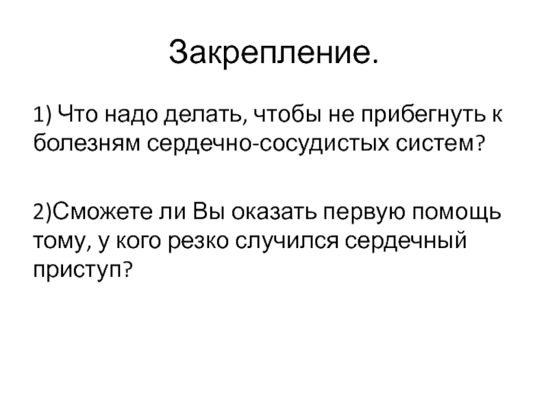 Закрепление.1) Что надо делать, чтобы не прибегнуть к болезням сердечно-сосудистых систем?2)Сможете ли Вы оказать первую помощь тому,