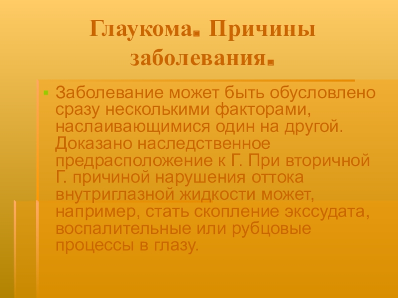 на другой. Доказано наследственное предрасположение к Г. При вторичной Г. причиной нарушения оттока внутриглазной жидкости может, например, стать скопление экссудата, воспалительные или рубцовые процессы в глазу.