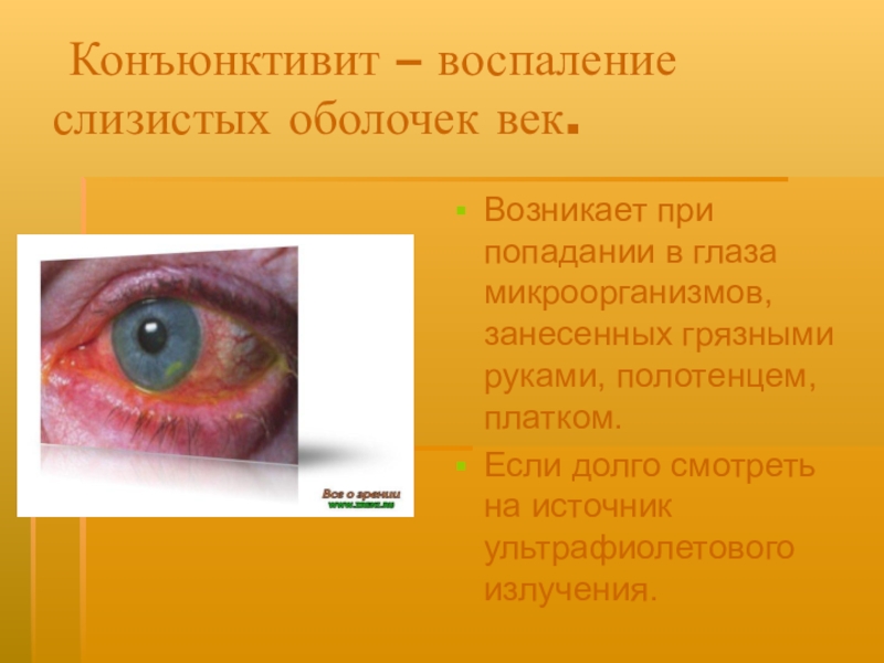 Слайд 14 Конъюнктивит – воспаление слизистых оболочек век.