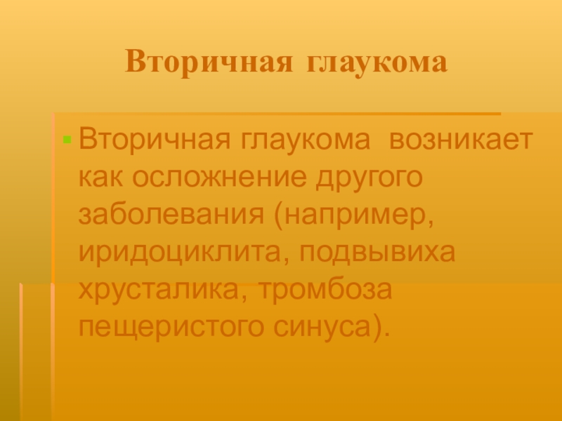 Вторичная глаукома возникает как осложнение другого заболевания (например, иридоциклита, подвывиха