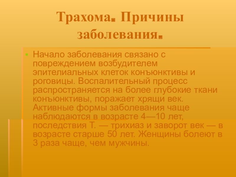и роговицы. Воспалительный процесс распространяется на более глубокие ткани конъюнктивы, поражает хрящи век. Активные формы заболевания чаще наблюдаются в возрасте 4—10 лет, последствия Т. — трихиаз и заворот век — в возрасте старше 50 лет. Женщины болеют в 3 раза чаще, чем мужчины.