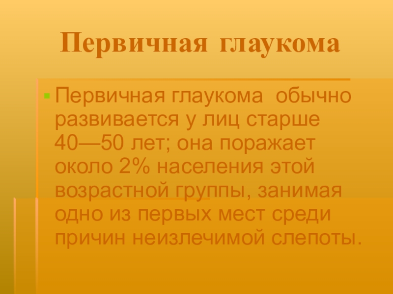 Первичная глаукома обычно развивается у лиц старше 40—50 лет; она