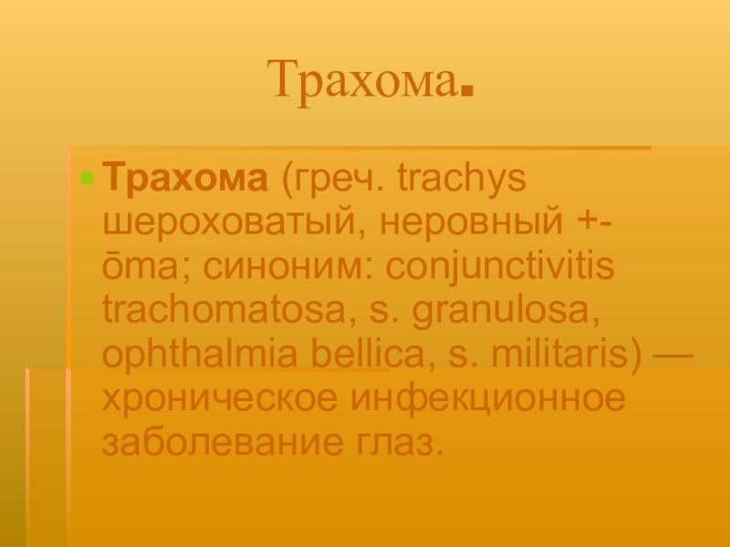 Трахома (греч. trachys шероховатый, неровный +-ōma; синоним: conjunctivitis trachomatosa, s. granulosa,