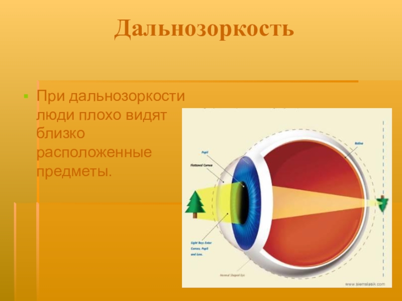 При дальнозоркости люди плохо видят близко расположенные предметы.