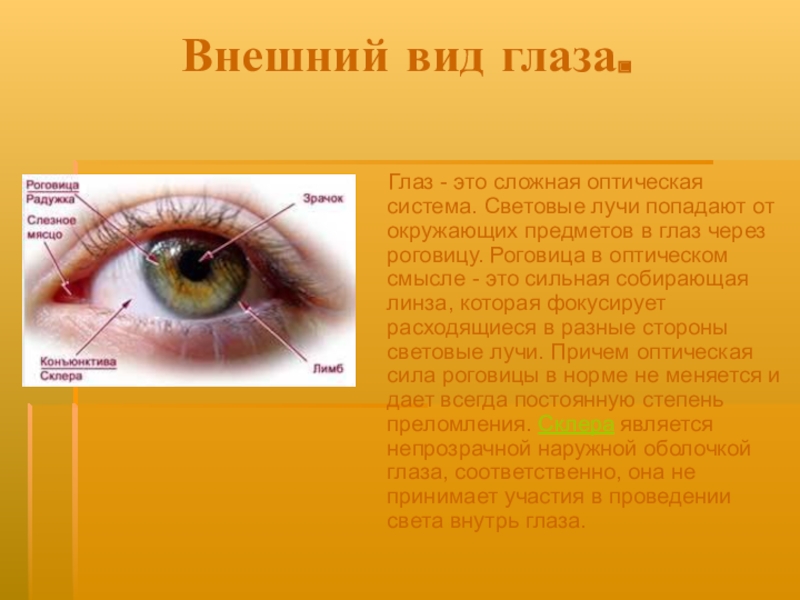 Световые лучи попадают от окружающих предметов в глаз через роговицу. Роговица в оптическом смысле - это сильная собирающая линза, которая фокусирует расходящиеся в разные стороны световые лучи. Причем оптическая сила роговицы в норме не меняется и дает всегда постоянную степень преломления. Склера является непрозрачной наружной оболочкой глаза, соответственно, она не принимает участия в проведении света внутрь глаза.