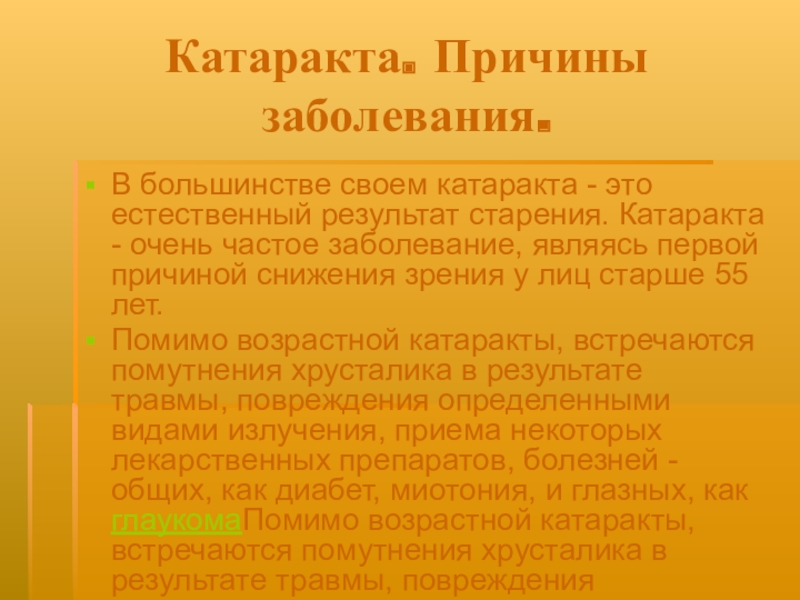 Помимо возрастной катаракты, встречаются помутнения хрусталика в результате травмы, повреждения определенными видами излучения, приема некоторых лекарственных препаратов, болезней - общих, как диабет, миотония, и глазных, как глаукомаПомимо возрастной катаракты, встречаются помутнения хрусталика в результате травмы, повреждения определенными видами излучения, приема некоторых лекарственных препаратов, болезней - общих, как диабет, миотония, и глазных, как глаукома, близорукость и других.