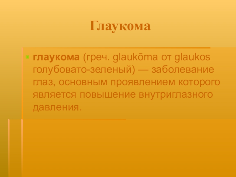 глаукома (греч. glaukōma от glaukos голубовато-зеленый) — заболевание глаз, основным проявлением