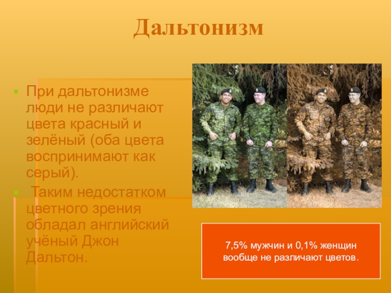 Таким недостатком цветного зрения обладал английский учёный Джон Дальтон.