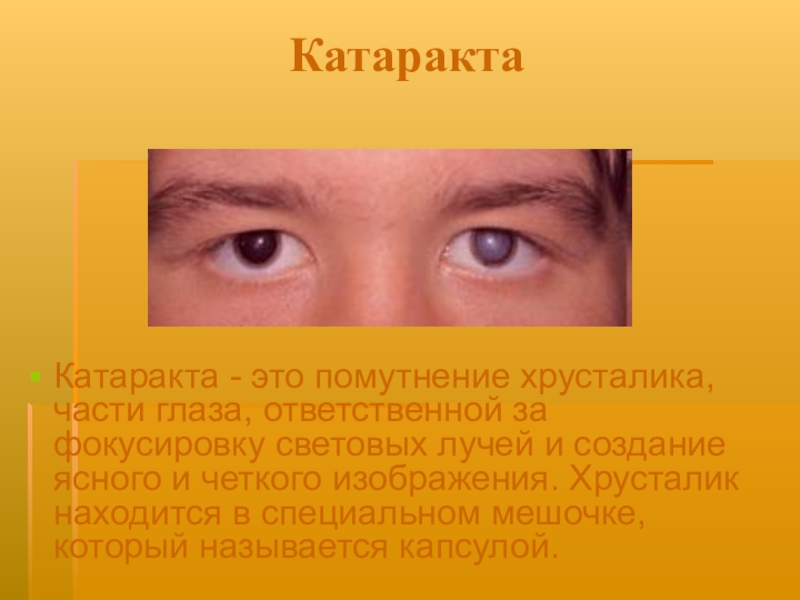 Катаракта - это помутнение хрусталика, части глаза, ответственной за фокусировку