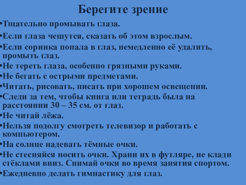 Берегите зрениеТщательно промывать глаза.Если глаза чешутся, сказать об этом взрослым.Если соринка попала в глаз, немедленно её удалить,