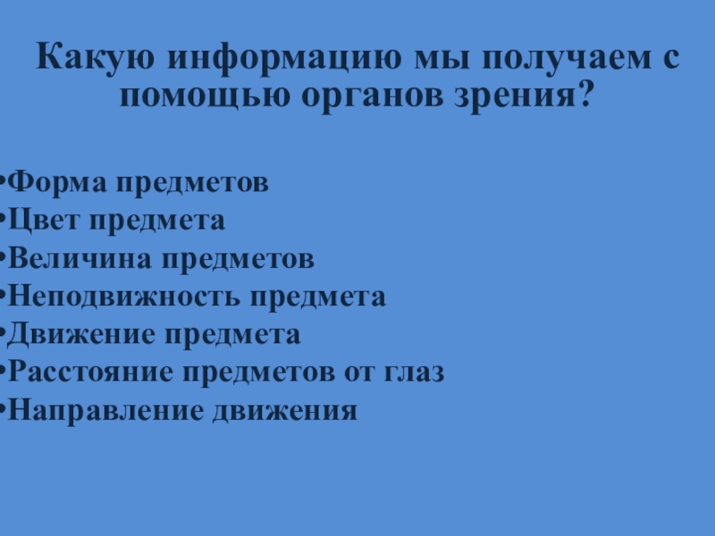 Какую информацию мы получаем с помощью органов зрения?Форма предметовЦвет предметаВеличина предметовНеподвижность предметаДвижение предметаРасстояние предметов от
