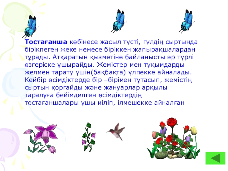 Слайд 14Тостағанша көбінесе жасыл түсті, гүлдің сыртында бірікпеген жеке немесе біріккен жапырақшалардан