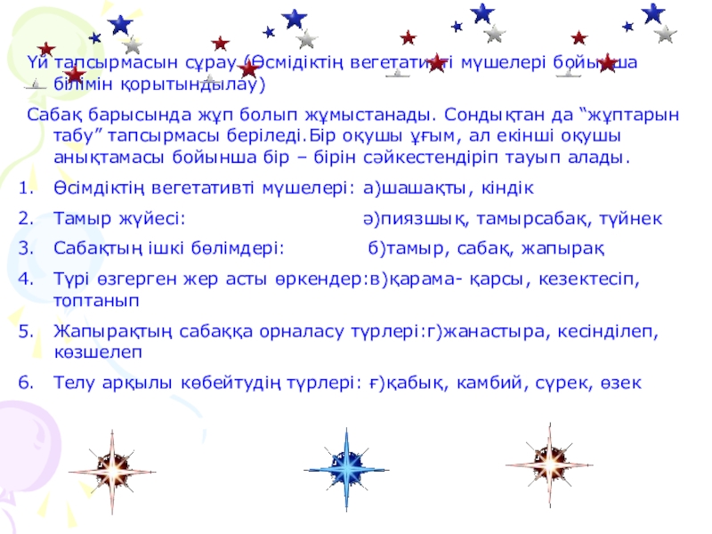 Слайд 3Үй тапсырмасын сұрау.(Өсмідіктің вегетативті мүшелері бойынша білімін қорытындылау)