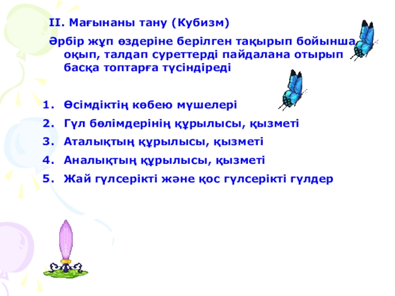 ІІ. Мағынаны тану (Кубизм)Әрбір жұп өздеріне берілген тақырып бойынша оқып, талдап суреттерді пайдалана отырып басқа топтарға түсіндіредіӨсімдіктің