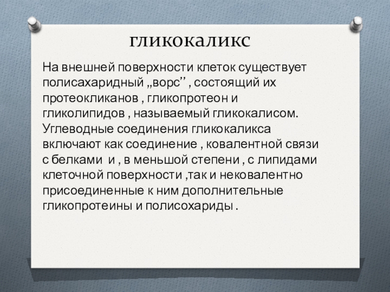 гликокаликсНа внешней поверхности клеток существует полисахаридный ,,ворс’’ , состоящий их протеокликанов , гликопротеон и гликолипидов , называемый