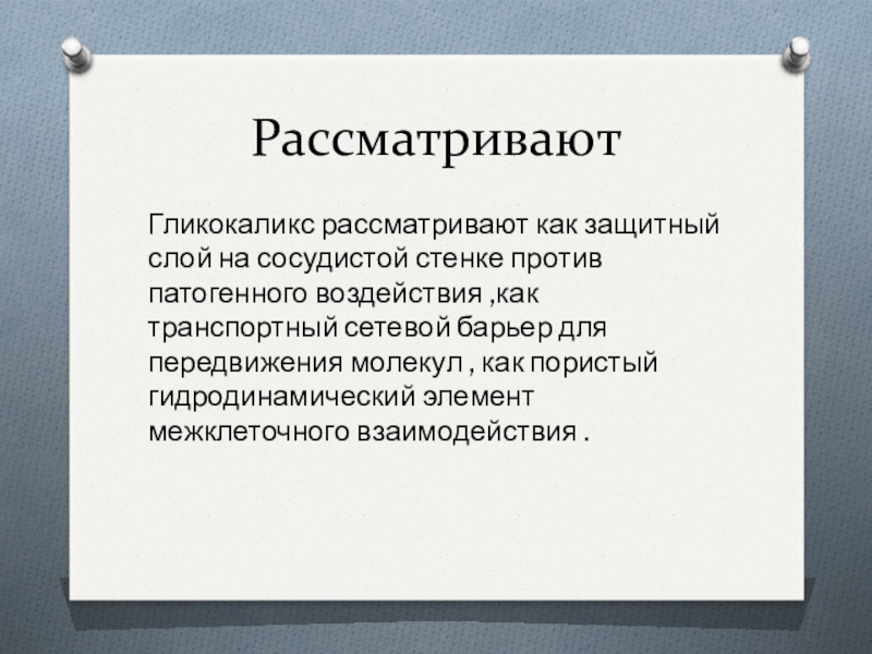 Рассматривают Гликокаликс рассматривают как защитный слой на сосудистой стенке против патогенного воздействия ,как транспортный сетевой барьер для