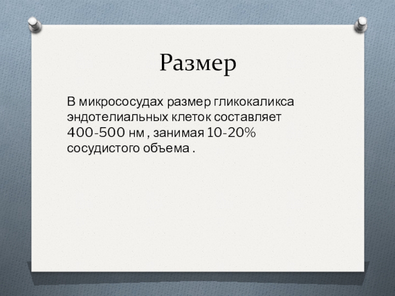 Размер В микрососудах размер гликокаликса эндотелиальных клеток составляет 400-500 нм , занимая 10-20% сосудистого объема .