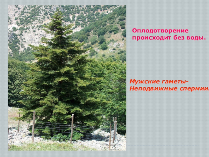 Оплодотворение происходит без воды.Мужские гаметы-Неподвижные спермии.