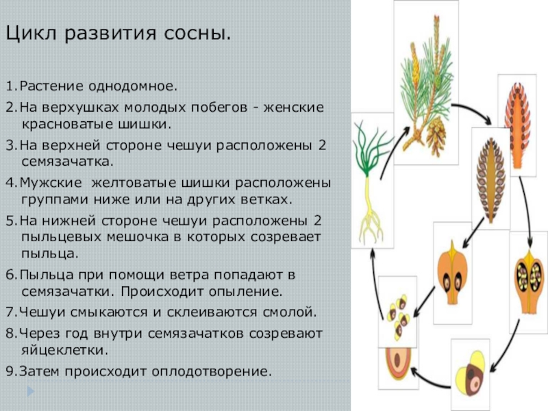 Цикл развития сосны.1.Растение однодомное.2.На верхушках молодых побегов - женские красноватые шишки.3.На верхней стороне чешуи расположены 2 семязачатка.4.Мужские